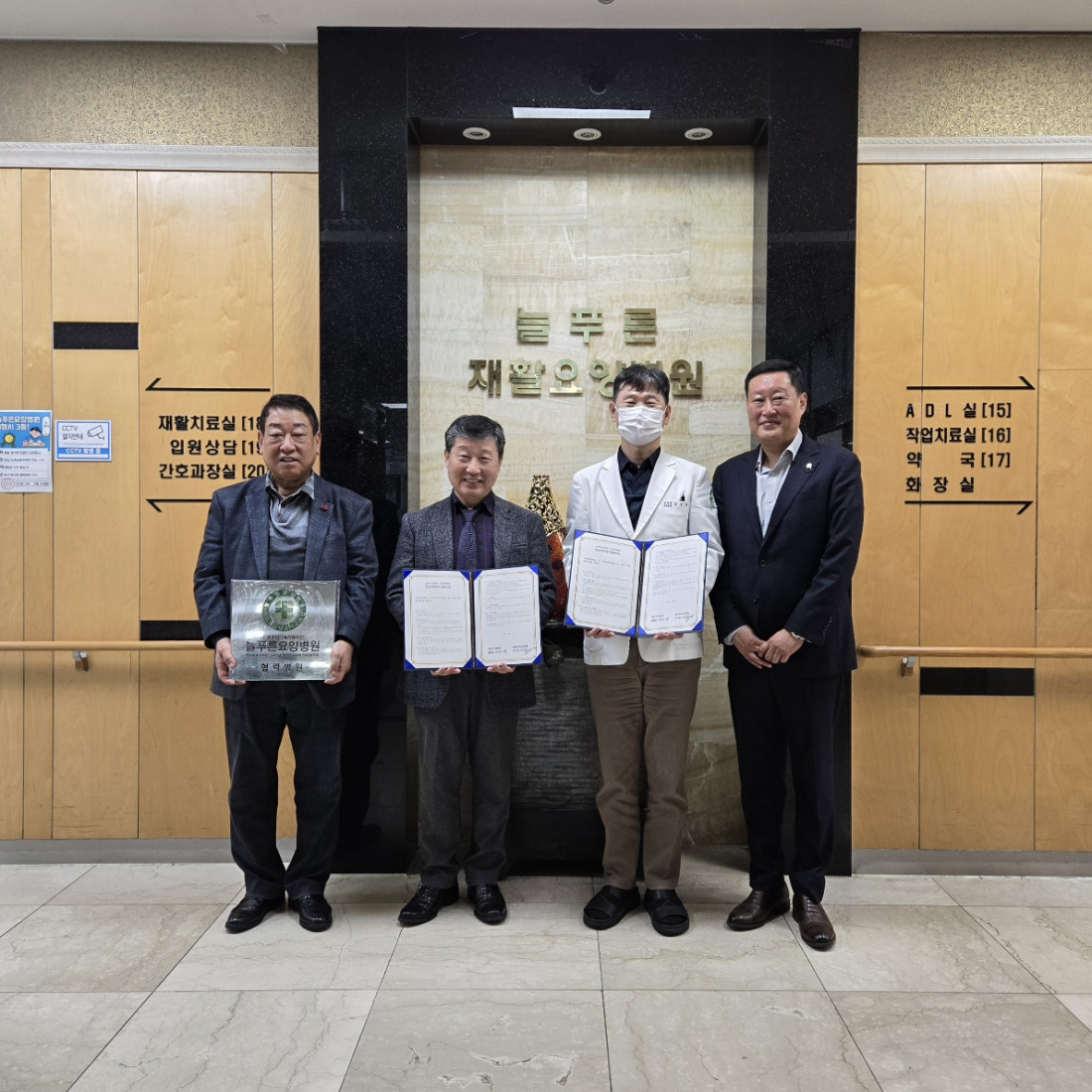 늘푸른요양병원, 현대병원과의 협약 체결 페이지 정보 작성자 : 사회복지실 조회수 : 39회 작성일 : 26-04-01 본문 3월 31일(화), 늘푸른요양병원과 현대병원이 업무 협약을 체결하였습니다. 목록 이전글이미용 봉사활동(2026.03) 26.04.01 다음글봄맞이 꽃 심기 26.03.31