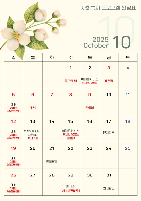 2025년 10월 사회복지 프로그램 페이지 정보 작성자 : 사회복지실 조회수 : 164회 작성일 : 25-10-10 본문 2025년 10월 사회복지 프로그램 일정표입니다. 목록 이전글2025년 11월 사회복지 프로그램 25.11.11 다음글2025년 9월 사회복지 프로그램 25.09.05