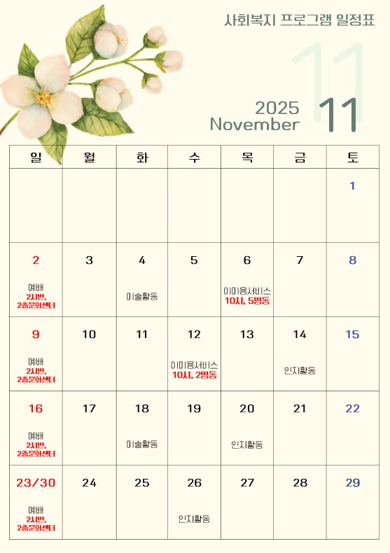 2025년 11월 사회복지 프로그램 페이지 정보 작성자 : 사회복지실 조회수 : 22회 작성일 : 25-11-11 본문 2025년 11월 사회복지 프로그램 일정표입니다. 목록 다음글2025년 10월 사회복지 프로그램 25.10.10