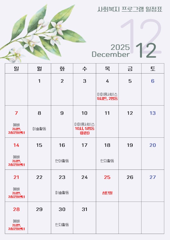2025년 12월 사회복지 프로그램 페이지 정보 작성자 : 사회복지실 조회수 : 110회 작성일 : 25-11-26 본문 2025년 12월 사회복지 프로그램 일정표입니다. 목록 다음글2025년 11월 사회복지 프로그램 25.11.11