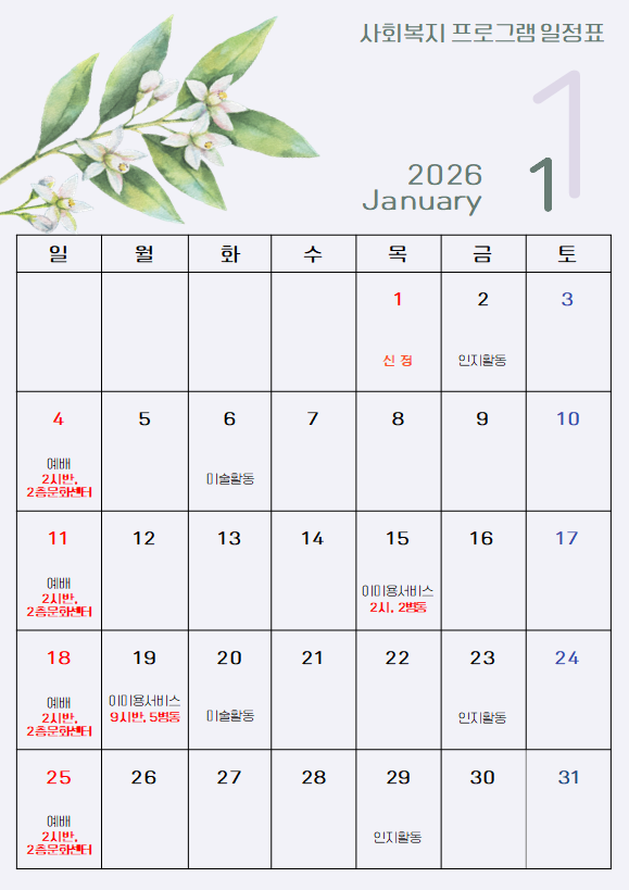 2026년 1월 사회복지 프로그램 페이지 정보 작성자 : 사회복지실 조회수 : 101회 작성일 : 26-01-30 본문 2026년 1월 사회복지 프로그램 일정표입니다. 목록 이전글2026년 2월 사회복지 프로그램 26.01.30 다음글2025년 12월 사회복지 프로그램 25.11.26