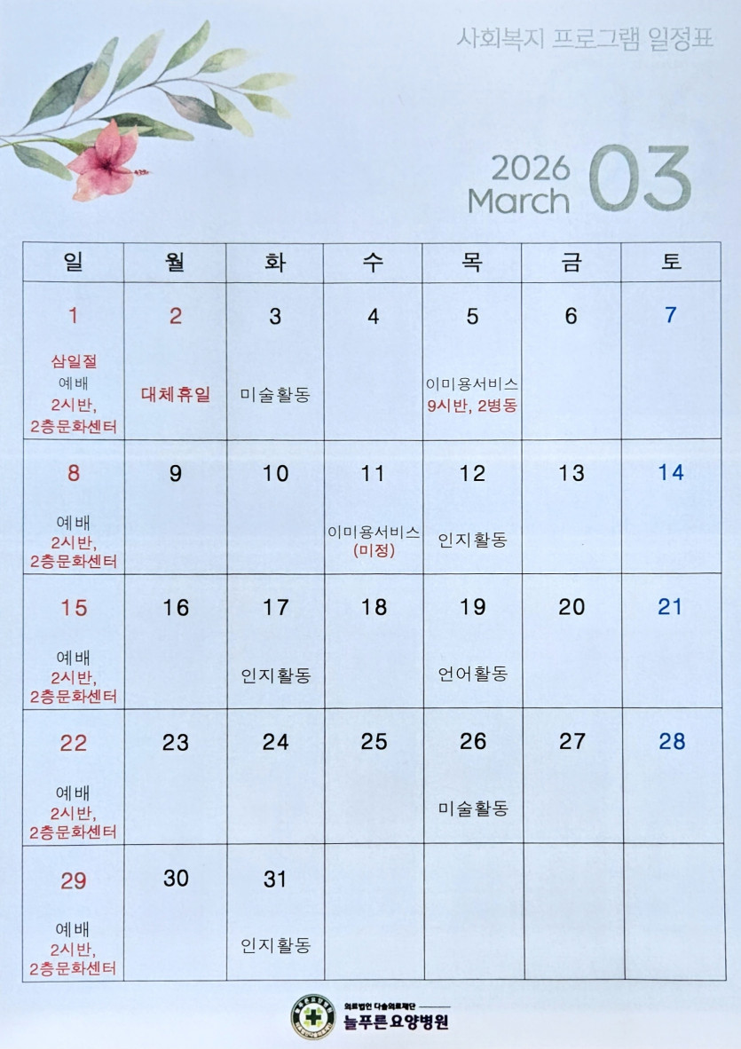 2026년 3월 사회복지 프로그램 페이지 정보 작성자 : 사회복지실 조회수 : 113회 작성일 : 26-02-27 본문 2026년 3월 사회복지 프로그램 일정표입니다. 목록 다음글2026년 2월 사회복지 프로그램 26.01.30