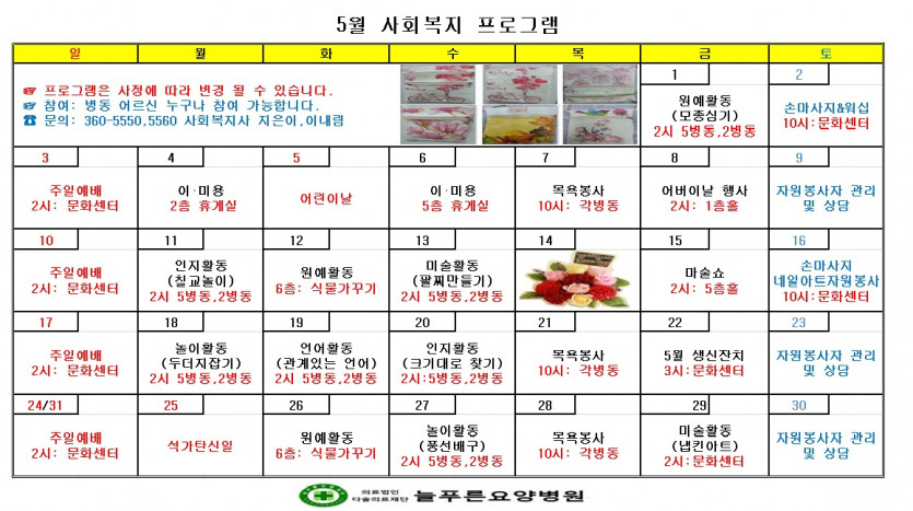 5월 프로그램 일정표 페이지 정보 작성자 : 미소천사 조회수 : 3,202회 작성일 : 15-05-11 본문 5월 사회복지 프로그램 일정입니다. 목록 이전글6월 사회복지 프로그램 15.06.01 다음글4월 사회복지 프로그램 15.04.03