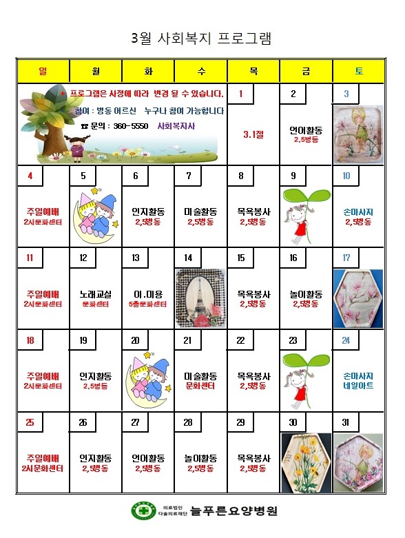 3월 사회복지 프로그램 페이지 정보 작성자 : 미소천사 조회수 : 3,273회 작성일 : 18-03-06 본문 3월 사회복지 프로그램입니다. 목록 이전글4월 사회복지 프로그램 18.04.02 다음글2월 사회복지 프로그램 18.02.02